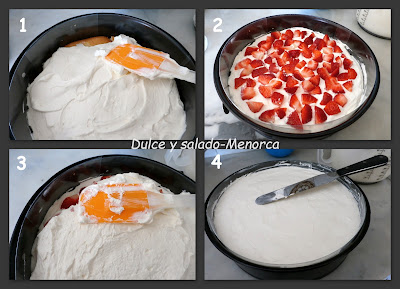 -Pondremos una capa de nata y mascarpone sobre los bizcochos, una de fresas cortadas y cubrimos con el resto de crema. Alisar y guardar en el frigorífico unas 4 ó 5 horas como mínimo. Mejor de un día para otro. Tapar con un papel de aluminio o papel film para que no absorba los olores de la nevera.